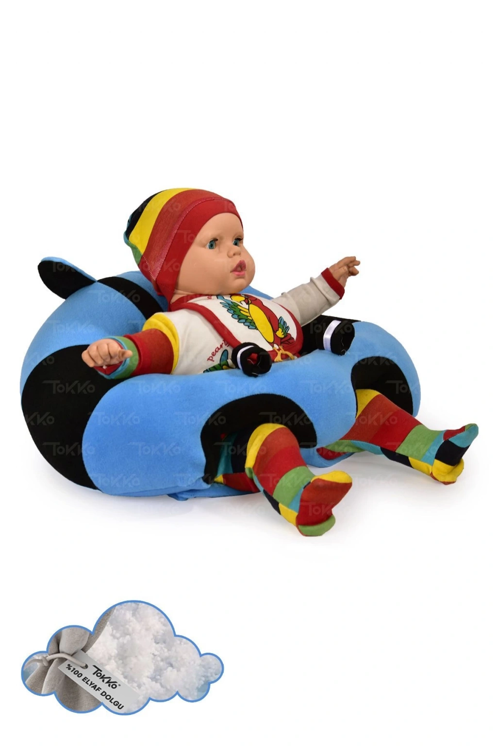Elyaf Dolgu Bebek Oturma Destek Minderi - Devrilmez Bebek Koltuğu - Büyük Bebek Oturağı Mavi Siyah