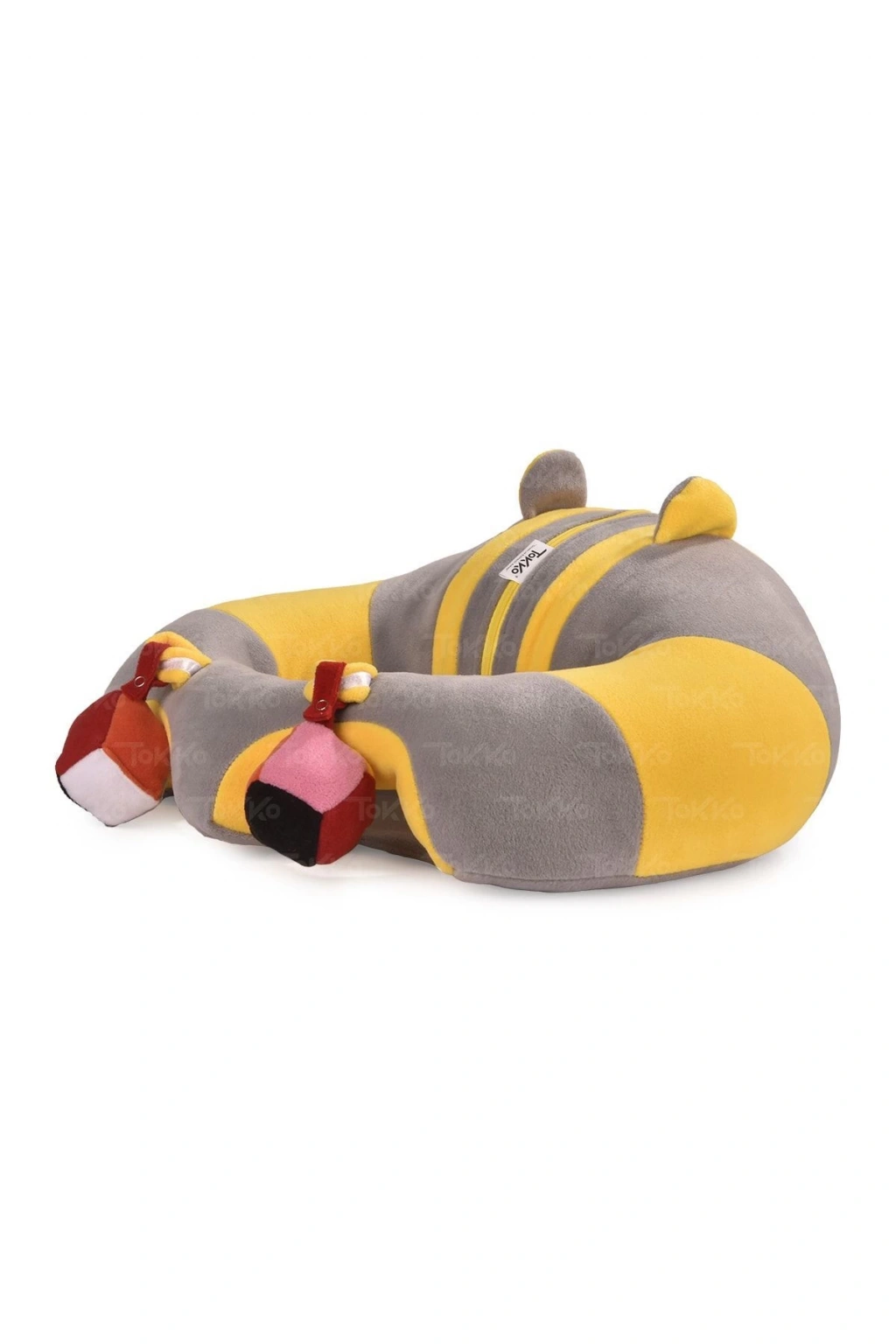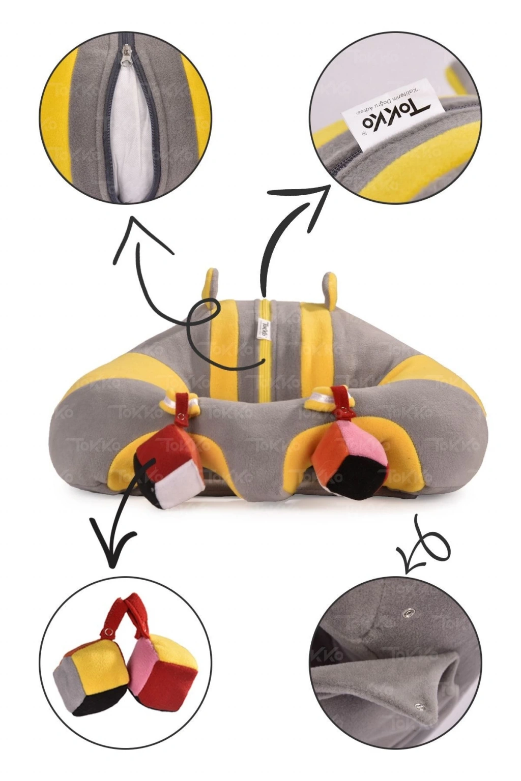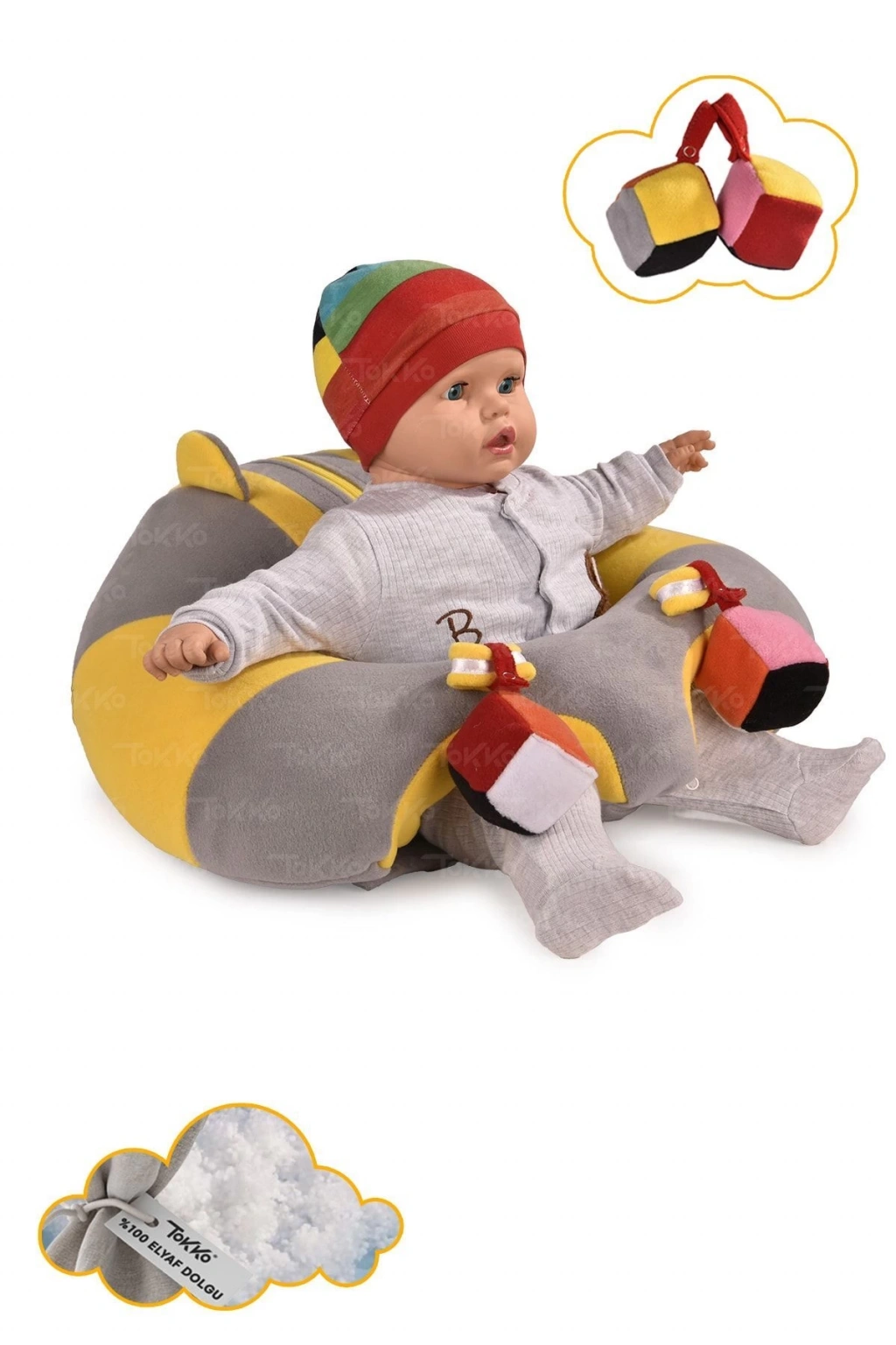 Oyuncaklı Bebek Oturma Destek Minderi - Devrilmez Bebek Koltuğu - Büyük Bebek Oturağı Gri Sarı