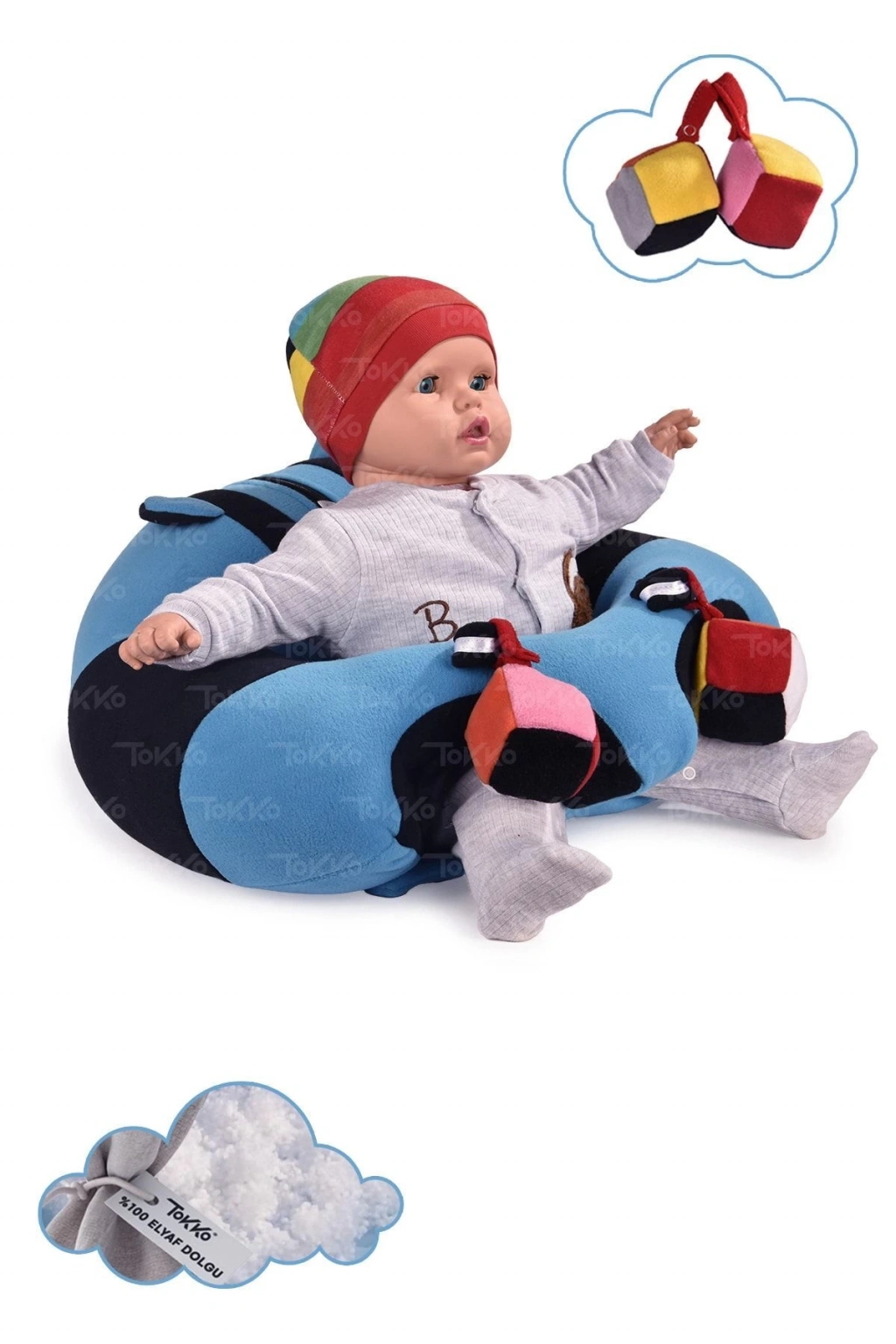 Oyuncaklı Bebek Oturma Destek Minderi - Devrilmez Bebek Koltuğu - Büyük Bebek Oturağı Mavi Beyaz