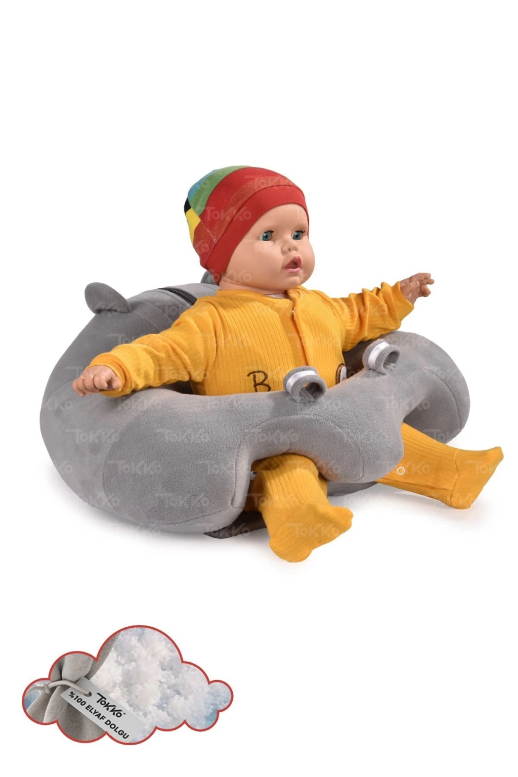 Elyaf Dolgu Bebek Oturma Destek Minderi - Devrilmez Bebek Koltuğu - Büyük Bebek Oturağı Sarı Gri